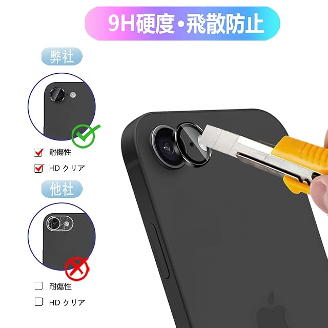 【アルミ合金製 耐衝撃性】 対応 iPhone 16E カメラフィルム 従来品のカメラフィルムと違って、カメラカバーはphoneと同じガラス、また航空機用アルミ合金を採用、耐衝撃性が普通製品より20倍高く、盛り上がったレンズを角や落下への衝撃からしっかりと保護。更に、表面にレ一ザ焼入れ技術を採用、優れた硬化層を形成、ダイヤモンドに匹敵する硬度を実現、鍵などの鋭利な物による擦り傷から守れる。