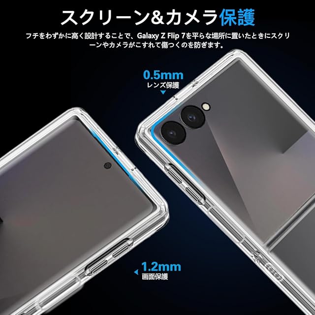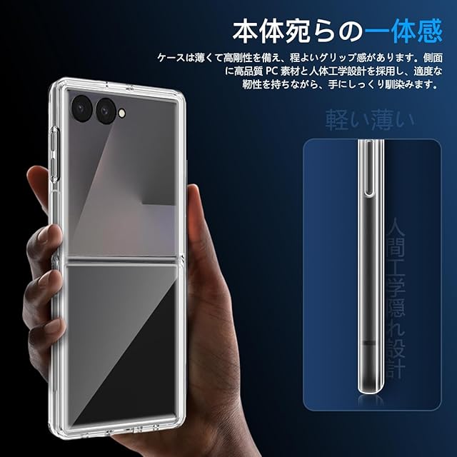 <b>★【製品仕様】</b><br>対応機種:Galaxy Z Flip 7 SC-55F / SCG35 用クリアケース<br>透明度や衝撃保護に優れて、薄さと強度のバランスを取り、日常の使い心地よい、細部まで追求したクリアケース。<br><b>★【抜群な耐衝擊性】</b><br>いくら気をつけていても落とす時がある!でも大丈夫!厳密なテストにより、ギャラクシーZ Flip 7が全面的に保護されることを実証しました。<br>2Mの高さから26回以上落としても本体は綺麗に無傷!Galaxy Z Flip 7を全方位からしっかりと守ります。<br><b>★【超高透過率&黄変防止】</b><br>99%に持ち上げた透明感が本体の美しさをそのまま、本体の崇高な美しさと高級感を損なわなく。<br>ドイツ製バイエルPC素材や高品質採用、スマホケースの黄変を効果的に防ぐことができます。<br><b>★【指紋防止&撥水撥油】</b><br>ケースには撥油コーティングが施されており、指紋や汚れなどに強くなめらかな操作感を実現、付着した汚れなどは簡単に拭きとれます。<br>背面に水紋を防ぐため、バックと本体の間に小さいドットを配置し、水紋を有効防止!<br><b>★【ワイヤレス充電対応】</b><br>ケースを付けたままでワイヤレス充電OK可能です。背面は放熱性良いポリカーボネート素材を使い、効果的に熱を放散し、バッテリーにも優しいです。<br>また、コネクタに干渉しにくい設計で、ケースをつけたままコネクタへの接続が可能です。<br><b>★【絶妙バランス・快適操作】</b><br>クリアケースの保護性能を保ちながら、スマートさを損なわないよう、このケースは薄さと強度のバランスを取り、手にフィットする程よい厚みで、<br>快適さが保ち、ボタンも押しやすく、最適な設計で作り出す。加工精度はピッタリ!スイッチ類、カメラ位置も含めて寸法はバッチリです!<br><b>★【取り付け簡単】</b><br>簡単に脱着する方法:スマホを横向きに左手で持ち。右手の親指でGalaxy Z Flip 7 SC-55F / SCG35カメラの部分を上に押しながら、右手の差し指でスマホケース右上の角を下に押し出してケースを外す。<br><b>★【安心】</b><br>こちらの ギャラクシーZ Flip 7 用クリア カバーには180日間の安心ながあります。<br>お客様にお届け前に検査スタッフが1個づつ品質チェックしておりますが、ご使用前に万が一、不良品がお手元に届いた場合は返金、交換、返品等の対応を取らせて頂きますので、安心してご注文ください。