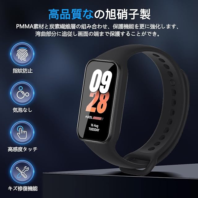 <b>【製品仕様】</b><br><b>対応機種:</b>Xiaomi Smart band 8 Active<br><b>素材:</b>柔軟性PMMA製素材<br><b>透過率:</b>99%<br><b>厚さ:</b>0.16mm超薄型<br><b>★【24時間自動修復技術】</b><br>優れた伸縮性を持っていて、フィルム表面の細いキズと貼り付け時に小さい気泡が発生てしまった場合、通常24時間内で消えます。<br><b>★【超高透過率】</b><br>透過率は約99%に達し、 画質も損なわないです。見た目・触り心地ともに何も付けてない状態と殆ど変わりません。<br>厚さ0.16mmの超極薄で,ハイビジョンの美しい画像を再現します。<br><b>★【指紋防止& 撥水撥油】</b><br>フィルムには撥油コーティングが施されており、指紋や汚れなどに強くなめらかな操作感を実現、<br>付着した汚れなどは簡単に拭きとれます。<br><b>★【スムーズな画面操作】</b><br>タッチパネルの感度が良くて、長時間ゲームをしても快適な操作可能です。<br><b>【パッケージ内容】</b><br>3×強化ガラス保護フィルム<br>3×アルコールパッド<br>3×ダストステッカー<br>1×気泡除去ヘラ<br>1x取扱説明書<br><b>【使い方】</b><br></b><br>ステップ1:まず、付属の緑色の「1」ウェットシートでスクリーンに付いた汚れを拭きとります。<br>ステップ2:次に、ピンク色の「2」ドライシートで水滴や指紋などを拭きとります。<br>ステップ3:付属の青色シールを使って、ホコリやごみをきれいに拭きとります。<br>ステップ4:フィルムを設備に貼ります。揭下透明的胶卷贴纸。液晶の上に軽く置きながら、位置を調整してください。埃が付かないように注意してください。<br>ステップ5:中央から外の方に、押しながら貼り付けます、さらに気泡除去ヘラで余分な気泡を拭き取る。<br><b>【安心】</b><br>こちらの Xiaomi band 8 Active 用 強化ガラス フィルムには180日間の安心ながあります。<br>お客様にお届け前に検査スタッフが1枚づつ品質チェックしておりますが、ご使用前に万が一、不良品がお手元に届いた場合は返金、交換、返品等の対応を取らせて頂きますので、安心してご注文ください。