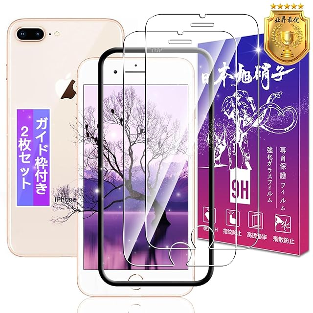 <b>【製品仕様】</b><br><b>対応機種:</b>iPhone 8 Plus / iPhone 7 Plus <br><b>硬度:</b>9H<br><b>透過率:</b>99%<br><b>厚さ:</b>0.26mm超薄型<br><b>★【強硬度9H 日本旭硝子】</b><br>高品質なの旭硝子製、業界最高レベルの硬度を誇ります。 高温クエンチ処理を経て, このスクリーンプロテクターは、通常のガラスよりも5倍高い125MPaの圧縮強度を有する。<br>万が一破損した際も飛散防止加工によって破片はほとんど飛び散らない安全性の高いガラスになっています。<br><b>★【超高透過率】</b><br>透過率は約99%に達し、 画質も損なわないです。見た目・触り心地ともに何も付けてない状態と殆ど変わりません。<br>厚さ0.26mmの超極薄で,ハイビジョンの美しい画像を再現します。<br><b>★【指紋防止& 撥水撥油】</b><br>ガラスフィルムには撥油コーティングが施されており、指紋や汚れなどに強くなめらかな操作感を実現、<br>付着した汚れなどは簡単に拭きとれます。<br><b>★【スムーズな画面操作】</b><br>タッチパネルの感度が良くて、長時間ゲームをしても快適な操作可能です。<br><b>【パッケージ内容】</b><br>2×強化ガラス保護フィルム<br>1 xガイド枠<br>1 x 取扱説明書<br><b>【使い方】</b><br>1.スマホ電源をオフにし、保護フィルムとクリーニングクロスなどを取り出してください。<br>2.液晶画面の汚れを拭き取る。<br>3.ホコリ取りシートを使って、液晶画面に残ったホコリや布繊維を取り除きます。<br>4.ガイド枠を本体位置に合わせて取り付ける。ホコリ取りシールを再度使用し、ホコリを除去する。<br>5.ガラスフィルムを取り出して、白い台紙を後ろから丁寧に剥がしてください。液晶画面に合うよう慎重にガラスフィルムをのせます。<br>6.保護フィルムを置いた後、指でゆっくりと液晶画面の最初から最後までスライドします。保護フィルムは自動的に端に吸着しますので、少々お待ちください。<br>7.残った気泡をクリーニングクロスで、フィルムの外側に向かって指で押し出すようにして取り除きます。<br><b>【安心】</b><br>こちらの アイフォン7 プラス / アイフォン8 プラス 用強化ガラスフィルムには180日間の安心ながあります。<br>お客様にお届け前に検査スタッフが1枚づつ品質チェックしておりますが、ご使用前に万が一、不良品がお手元に届いた場合は返金、交換、返品等の対応を取らせて頂きますので、安心してご注文ください。