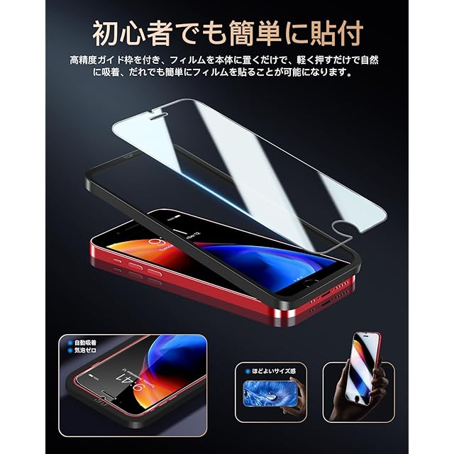 【専用のガイド枠】専用のガイド枠付きで、正確な位置に完璧に貼り付けることができます、保護フィルムの接着面は特殊な自動吸着層を使用しているので、ガラスを液晶に置くだけで自然に吸着し、気泡が出来にくいので、 誰でも簡単、綺麗に貼ることができます。