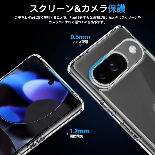 <b>★【製品仕様】</b><br>対応機種:Google Pixel 9 用クリアケース<br>透明度や衝撃保護に優れて、薄さと強度のバランスを取り、日常の使い心地よい、細部まで追求したクリアケース。<br><b>★【抜群な耐衝擊性】</b><br>いくら気をつけていても落とす時がある!でも大丈夫!厳密なテストにより、Pixel9が全面的に保護されることを実証しました。<br>2Mの高さから26回以上落としても本体は綺麗に無傷!また、四隅には高耐震クッションを搭載しており、高い耐衝撃性を誇り、Google Pixel 9を全方位からしっかりと守ります。<br><b>★【超高透過率&黄変防止】</b><br>99%に持ち上げた透明感が本体の美しさをそのまま、本体の崇高な美しさと高級感を損なわなく。<br>ドイツ製バイエルTPU素材や高品質のPC素材を採用、スマホケースの黄変を効果的に防ぐことができます。<br><b>★【指紋防止&撥水撥油】</b><br>ケースには撥油コーティングが施されており、指紋や汚れなどに強くなめらかな操作感を実現、付着した汚れなどは簡単に拭きとれます。<br>背面に水紋を防ぐため、バックと本体の間に小さいドットを配置し、水紋を有効防止!<br><b>★【ワイヤレス充電対応】</b><br>ケースを付けたままでワイヤレス充電OK可能です。背面は放熱性良いポリカーボネート素材を使い、効果的に熱を放散し、バッテリーにも優しいです。<br>また、コネクタに干渉しにくい設計で、ケースをつけたままコネクタへの接続が可能です。<br><b>★【絶妙バランス・快適操作】</b><br>クリアケースの保護性能を保ちながら、スマートさを損なわないよう、このケースは薄さと強度のバランスを取り、手にフィットする程よい厚みで、<br>快適さが保ち、ボタンも押しやすく、最適な設計で作り出す。加工精度はピッタリ!スイッチ類、カメラ位置も含めて寸法はバッチリです!<br><b>★【取り付け簡単】</b><br>簡単に脱着する方法:スマホを横向きに左手で持ち。右手の親指でGoogle Pixel 9カメラの部分を上に押しながら、右手の差し指でスマホケース右上の角を下に押し出してケースを外す。<br><b>★【安心】</b><br>こちらの ピクセル9 用クリア カバーには180日間の安心ながあります。<br>お客様にお届け前に検査スタッフが1個づつ品質チェックしておりますが、ご使用前に万が一、不良品がお手元に届いた場合は返金、交換、返品等の対応を取らせて頂きますので、安心してご注文ください。