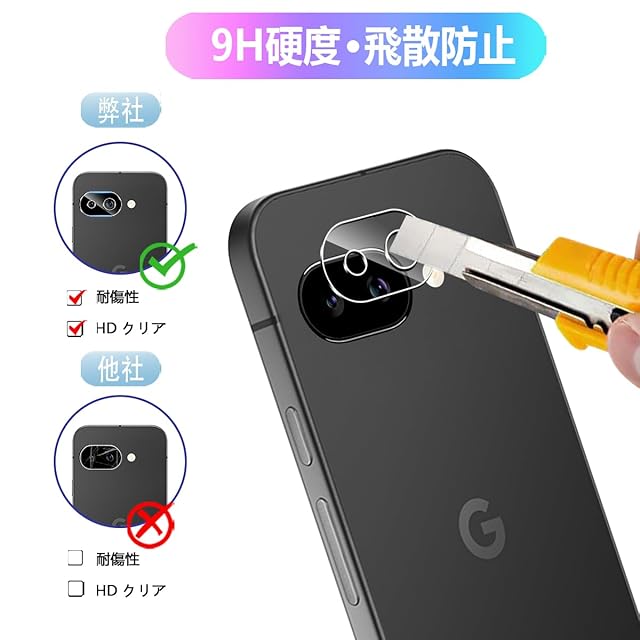 【9H硬度 飛散防止】 対応 Pixel 9a カメラフィルム はす旭硝子で作られており、スマホ保護フィルムの中で最高レベルの9H硬度に達しています。手にフィットして持ちやすく滑りにくいので落ちにくいです。万が一落ちてもフィルムが衝撃を吸収してくれるので、レンズの損傷を低限まで抑えられます。また、特殊な飛散防止設計により、ガラスが割れても飛散しないため。