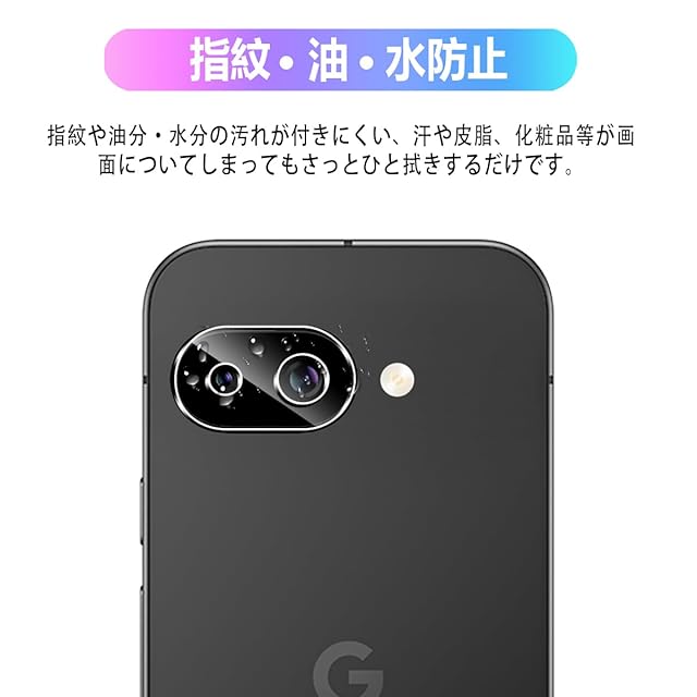 <b>【製品仕様】</b><br><b>対応機種:</b>Google Pixel 9a <br><b>硬度:</b>9H<br><b>透過率:</b>99%<br><b>厚さ:</b>0.26mm超薄型<br><b>★【強硬度9H 日本旭硝子】</b><br>高品質なの旭硝子製、業界最高レベルの硬度を誇ります。 高温クエンチ処理を経て, このレンズプロテクターは、通常のガラスよりも5倍高い125MPaの圧縮強度を有する。<br>万が一破損した際も飛散防止加工によって破片はほとんど飛び散らない安全性の高いガラスになっています。<br><b>★【超高透過率】</b><br>透過率は約99%に達し、 画質も損なわないです。見た目・触り心地ともに何も付けてない状態と殆ど変わりません。<br>厚さ0.26mmの超極薄で,ハイビジョンの美しい画像を再現します。<br><b>★【指紋防止& 撥水撥油】</b><br>カメラフィルムには撥油コーティングが施されており、指紋や汚れなどに強くなめらかな操作感を実現、<br>付着した汚れなどは簡単に拭きとれます。<br><b>【パッケージ内容】</b><br>2×強化ガラスカメラ保護フィルム<br>1 x 取扱説明書<br><b>【使い方】</b><br>1.スマホ電源をオフにし、カメラ保護フィルムとクリーニングクロスなどを取り出してください。<br>2.レンズの汚れを拭き取る。<br>3.ホコリ取りシートを使って、レンズに残ったホコリや布繊維を取り除きます。<br>4.カメラ保護フィルムの裏面の保護シートを剥がしてください。カメラ保護フィルムをレンズに合わせて軽く置いてください。<br>5.カメラ保護フィルムを置いた後、指でゆっくりとレンズの最初から最後までスライドします。カメラ保護フィルムは自動的に端に吸着しますので、少々お待ちください。<br>6.残った気泡をクリーニングクロスで、フィルムの外側に向かって指で押し出すようにして取り除きます。<br>7.貼り付けが完了。クリーニングクロスでレンズをよく拭いてください。<br><b>【安心】</b><br>こちらの グーグルピクセル9a 用レンズフィルムには180日間の安心ながあります。<br>お客様にお届け前に検査スタッフが1枚づつ品質チェックしておりますが、ご使用前に万が一、不良品がお手元に届いた場合は返金、交換、返品等の対応を取らせて頂きますので、安心してご注文ください。