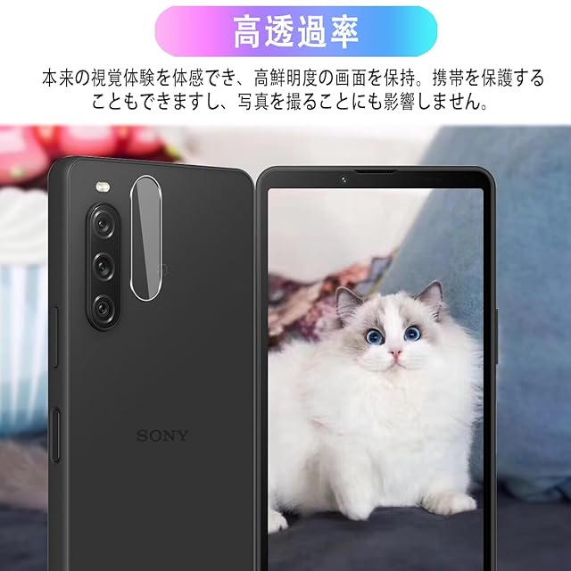 <b>【製品仕様】</b><br><b>対応機種:</b>Xperia 10 V SO-52D / SOG11 <br><b>硬度:</b>9H<br><b>透過率:</b>99%<br><b>厚さ:</b>0.26mm超薄型<br><b>★【強硬度9H 日本旭硝子】</b><br>高品質なの旭硝子製、業界最高レベルの硬度を誇ります。 高温クエンチ処理を経て, このレンズプロテクターは、通常のガラスよりも5倍高い125MPaの圧縮強度を有する。<br>万が一破損した際も飛散防止加工によって破片はほとんど飛び散らない安全性の高いガラスになっています。<br><b>★【超高透過率】</b><br>透過率は約99%に達し、 画質も損なわないです。見た目・触り心地ともに何も付けてない状態と殆ど変わりません。<br>厚さ0.26mmの超極薄で,ハイビジョンの美しい画像を再現します。<br><b>★【指紋防止& 撥水撥油】</b><br>カメラフィルムには撥油コーティングが施されており、指紋や汚れなどに強くなめらかな操作感を実現、<br>付着した汚れなどは簡単に拭きとれます。<br><b>【 パッケージ内容】</b><br>2×強化ガラスカメラ保護フィルム<br>2×アルコールパッド<br>2×ダストステッカー<br>1 x 取扱説明書<br><b>【使い方】</b><br>1.スマホ電源をオフにし、カメラ保護フィルムとクリーニングクロスなどを取り出してください。<br>2.アルコールパッドを使ってレンズの汚れを拭き取リます。<br>3.ホコリ取りシートを使って、レンズに残ったホコリや布繊維を取り除きます。<br>4.カメラ保護フィルムの裏面の保護シートを剥がしてください。カメラ保護フィルムをレンズに合わせて軽く置いてください。<br>5.カメラ保護フィルムを置いた後、指でゆっくりとレンズの最初から最後までスライドします。カメラ保護フィルムは自動的に端に吸着しますので、少々お待ちください。<br>6.残った気泡をクリーニングクロスで、フィルムの外側に向かって指で押し出すようにして取り除きます。<br>7.貼り付けが完了。クリーニングクロスでレンズをよく拭いてください。<br><b>【安心】</b><br>こちらの Xperia 10 V 用レンズフィルムには180日間の安心ながあります。<br>お客様にお届け前に検査スタッフが1枚づつ品質チェックしておりますが、ご使用前に万が一、不良品がお手元に届いた場合は返金、交換、返品等の対応を取らせて頂きますので、安心してご注文ください。