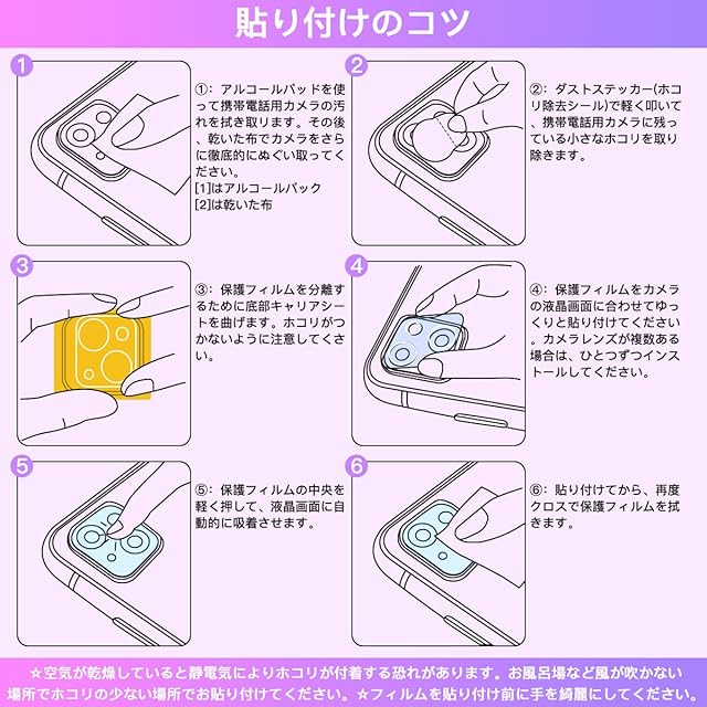 【指紋、油、水防止】カメラフィルムの表面特殊な疎油処理されているため、画面感度に影響しなくて、簡単にタッチすることができ、指触りが抜群です。指紋や油分·水分の汚れが付きにくい、汗や皮脂、化粧品等が画面についてしまってもさっとひと拭きするだけです。