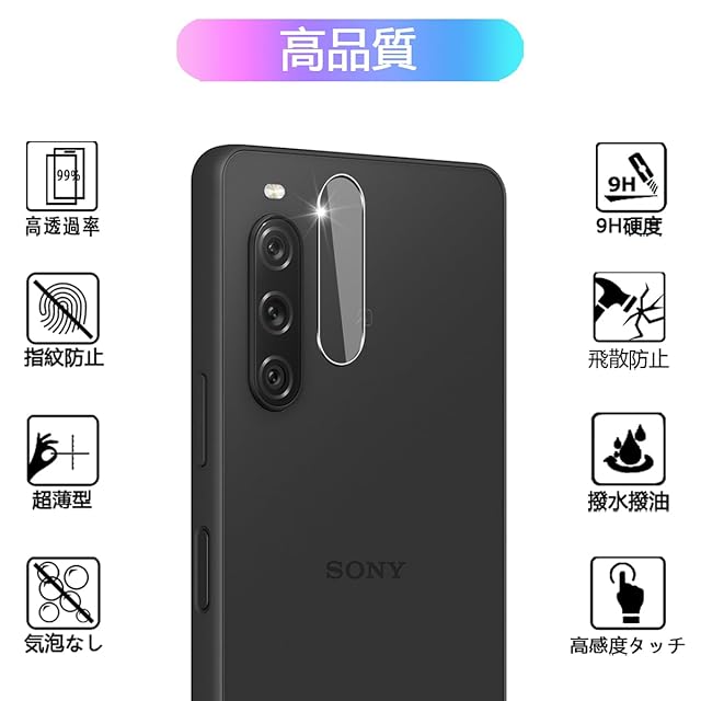 【9H硬度 飛散防止】 対応 エクスペリア10 V カメラフィルム はす旭硝子で作られており、スマホ保護フィルムの中で最高レベルの9H硬度に達しています。手にフィットして持ちやすく滑りにくいので落ちにくいです。万が一落ちてもフィルムが衝撃を吸収してくれるので、レンズの損傷を低限まで抑えられます。また、特殊な飛散防止設計により、ガラスが割れても飛散しないため。