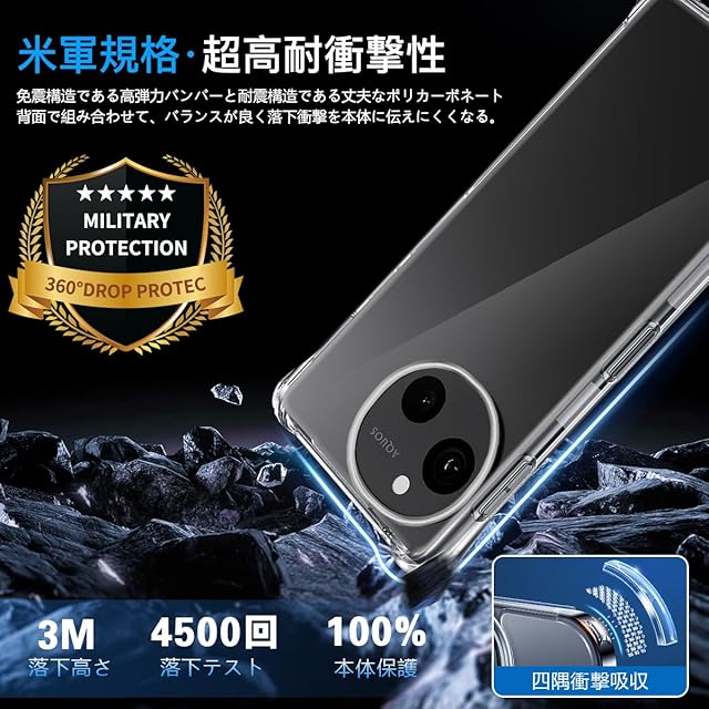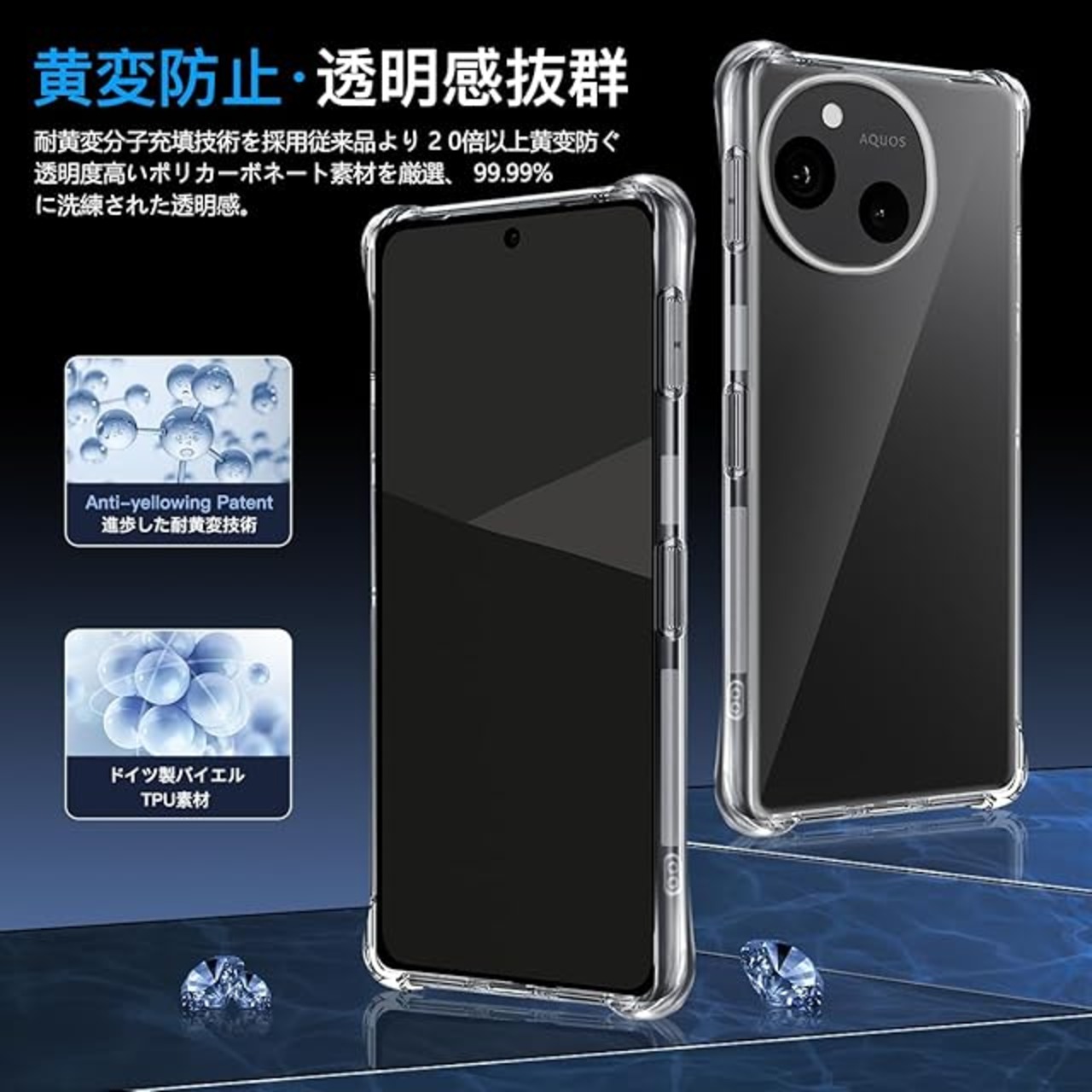 <b>★【製品仕様】</b><br>対応機種:AQUOS sense10 SH-53F SH-M33 用クリアケース<br>透明度や衝撃保護に優れて、薄さと強度のバランスを取り、日常の使い心地よい、細部まで追求したクリアケース。<br><b>★【抜群な耐衝擊性】</b><br>いくら気をつけていても落とす時がある!でも大丈夫!厳密なテストにより、AQUOS sense10が全面的に保護されることを実証しました。<br>2Mの高さから26回以上落としても本体は綺麗に無傷!また、四隅には高耐震クッションを搭載しており、高い耐衝撃性を誇り、AQUOS sense9 を全方位からしっかりと守ります。<br><b>★【超高透過率&黄変防止】</b><br>99%に持ち上げた透明感が本体の美しさをそのまま、本体の崇高な美しさと高級感を損なわなく。<br>ドイツ製バイエルTPU素材や高品質のPC素材を採用、スマホケースの黄変を効果的に防ぐことができます。<br><b>★【指紋防止&撥水撥油】</b><br>ケースには撥油コーティングが施されており、指紋や汚れなどに強くなめらかな操作感を実現、付着した汚れなどは簡単に拭きとれます。<br>背面に水紋を防ぐため、バックと本体の間に小さいドットを配置し、水紋を有効防止!<br><b>★【ワイヤレス充電対応】</b><br>ケースを付けたままでワイヤレス充電OK可能です。背面は放熱性良いポリカーボネート素材を使い、効果的に熱を放散し、バッテリーにも優しいです。<br>また、コネクタに干渉しにくい設計で、ケースをつけたままコネクタへの接続が可能です。<br><b>★【絶妙バランス・快適操作】</b><br>クリアケースの保護性能を保ちながら、スマートさを損なわないよう、このケースは薄さと強度のバランスを取り、手にフィットする程よい厚みで、<br>快適さが保ち、ボタンも押しやすく、最適な設計で作り出す。加工精度はピッタリ!スイッチ類、カメラ位置も含めて寸法はバッチリです!<br><b>★【取り付け簡単】</b><br>簡単に脱着する方法:スマホを横向きに左手で持ち。右手の親指でアクオスセンス10 カメラの部分を上に押しながら、右手の差し指でスマホケース右上の角を下に押し出してケースを外す。<br><b>★【安心】</b><br>こちらの アクオスセンス10 用クリア カバーには180日間の安心ながあります。<br>お客様にお届け前に検査スタッフが1個づつ品質チェックしておりますが、ご使用前に万が一、不良品がお手元に届いた場合は返金、交換、返品等の対応を取らせて頂きますので、安心してご注文ください。