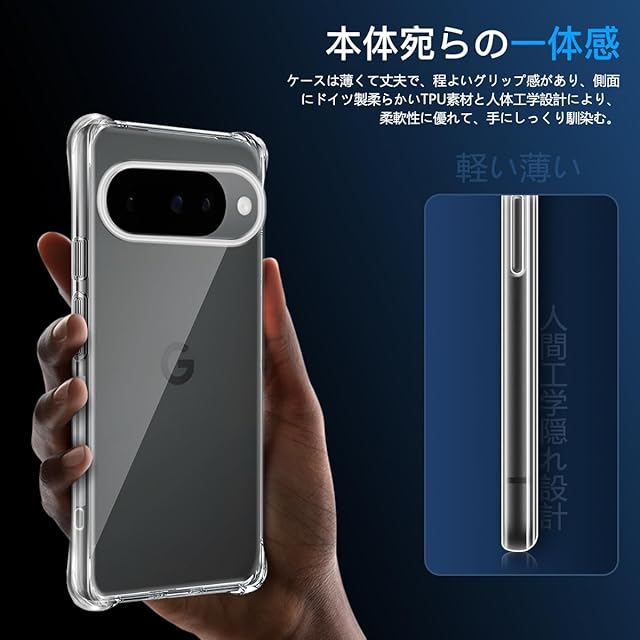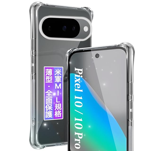 <b>★【製品仕様】</b><br>対応機種:google pixel 10 / pixel 10 pro 用クリアケース<br>透明度や衝撃保護に優れて、薄さと強度のバランスを取り、日常の使い心地よい、細部まで追求したクリアケース。<br><b>★【抜群な耐衝擊性】</b><br>いくら気をつけていても落とす時がある!でも大丈夫!厳密なテストにより、グーグルピクセル10 / ピクセル10プロが全面的に保護されることを実証しました。<br>2Mの高さから26回以上落としても本体は綺麗に無傷!また、四隅には高耐震クッションを搭載しており、高い耐衝撃性を誇り、pixel10 / Pixel10proを全方位からしっかりと守ります。<br><b>★【超高透過率&黄変防止】</b><br>99%に持ち上げた透明感が本体の美しさをそのまま、本体の崇高な美しさと高級感を損なわなく。<br>ドイツ製バイエルTPU素材や高品質採用、スマホケースの黄変を効果的に防ぐことができます。<br><b>★【指紋防止&撥水撥油】</b><br>ケースには撥油コーティングが施されており、指紋や汚れなどに強くなめらかな操作感を実現、付着した汚れなどは簡単に拭きとれます。<br>背面に水紋を防ぐため、バックと本体の間に小さいドットを配置し、水紋を有効防止!<br><b>★【ワイヤレス充電対応】</b><br>ケースを付けたままでワイヤレス充電OK可能です。背面は放熱性良いポリカーボネート素材を使い、効果的に熱を放散し、バッテリーにも優しいです。<br>また、コネクタに干渉しにくい設計で、ケースをつけたままコネクタへの接続が可能です。<br><b>★【絶妙バランス・快適操作】</b><br>クリアケースの保護性能を保ちながら、スマートさを損なわないよう、このケースは薄さと強度のバランスを取り、手にフィットする程よい厚みで、<br>快適さが保ち、ボタンも押しやすく、最適な設計で作り出す。加工精度はピッタリ!スイッチ類、カメラ位置も含めて寸法はバッチリです!<br><b>★【取り付け簡単】</b><br>簡単に脱着する方法:スマホを横向きに左手で持ち。右手の親指でgoogle pixel 10 / pixel 10 proカメラの部分を上に押しながら、右手の差し指でスマホケース右上の角を下に押し出してケースを外す。<br><b>★【安心】</b><br>こちらの google pixel 10 / pixel 10 pro 用クリア カバーには180日間の安心ながあります。<br>お客様にお届け前に検査スタッフが1個づつ品質チェックしておりますが、ご使用前に万が一、不良品がお手元に届いた場合は返金、交換、返品等の対応を取らせて頂きますので、安心してご注文ください。