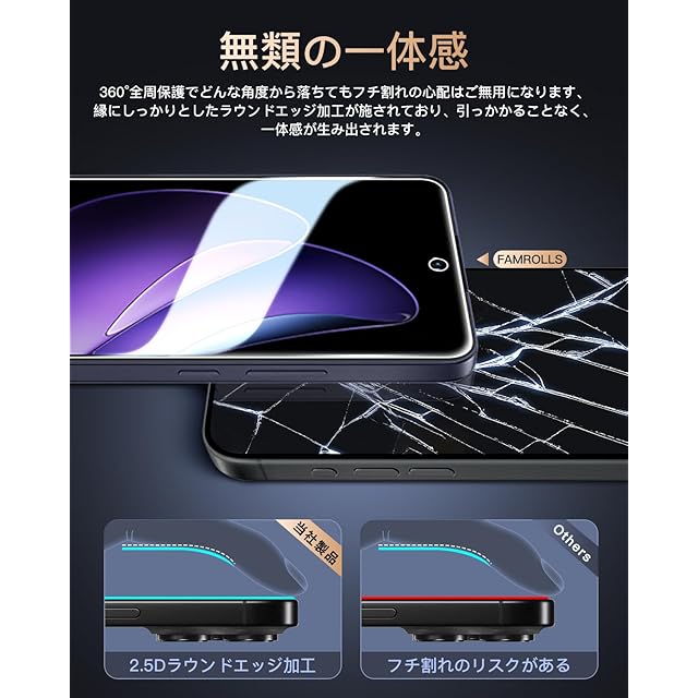 【9H硬度 飛散防止】スマホフィルムとレンズ保護フィルムはすべて旭硝子で作られており、スマホ保護フィルムの中で高レベルの9H硬度に達しています。手にフィットして持ちやすく滑りにくいので落ちにくいです。万が一落ちてもフィルムが衝撃を吸収してくれるので、スクリーンの損傷を低限まで抑えられます。また、特殊な飛散防止設計により、ガラスが割れても飛散しないため。