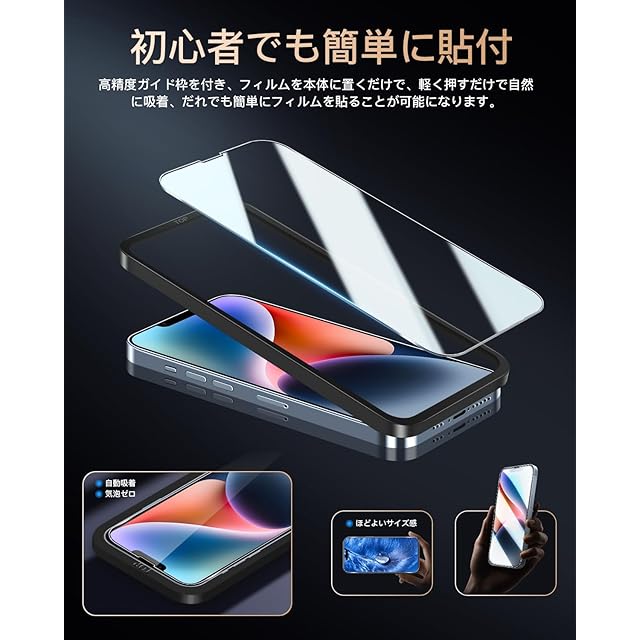 【9H硬度 飛散防止】スマホフィルムとレンズ保護フィルムはすべて旭硝子で作られており、スマホ保護フィルムの中で最高レベルの9H硬度に達しています。手にフィットして持ちやすく滑りにくいので落ちにくいです。万が一落ちてもフィルムが衝撃を吸収してくれるので、スクリーンの損傷を最低限まで抑えられます。また、特殊な飛散防止設計により、ガラスが割れても飛散しないため、安心してお使いいただけます。
