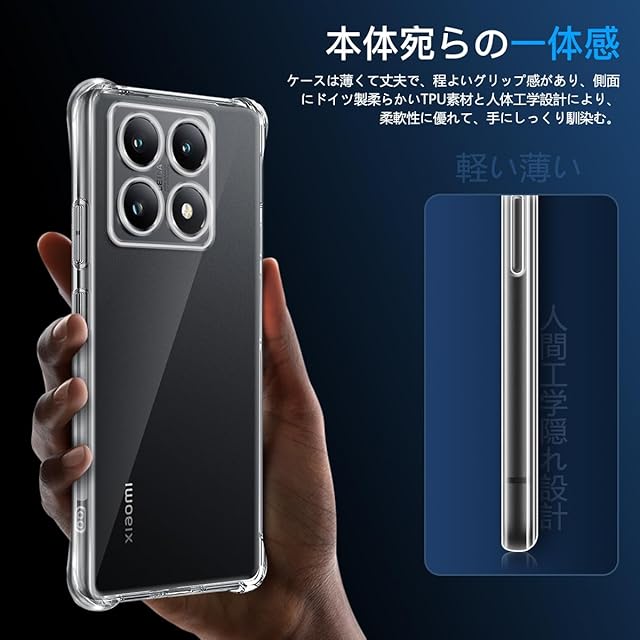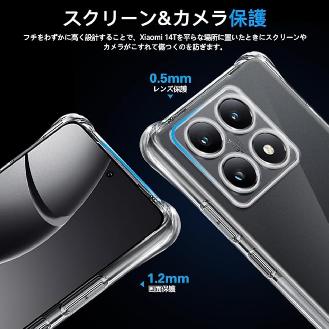 <b>★【製品仕様】</b><br>対応機種:Xiaomi 14T 用クリアケース<br>透明度や衝撃保護に優れて、薄さと強度のバランスを取り、日常の使い心地よい、細部まで追求したクリアケース。<br><b>★【抜群な耐衝擊性】</b><br>いくら気をつけていても落とす時がある!でも大丈夫!厳密なテストにより、Xiaomi14Tが全面的に保護されることを実証しました。<br>2Mの高さから26回以上落としても本体は綺麗に無傷!また、四隅には高耐震クッションを搭載しており、高い耐衝撃性を誇り、Xiaomi 14Tを全方位からしっかりと守ります。<br><b>★【超高透過率&黄変防止】</b><br>99%に持ち上げた透明感が本体の美しさをそのまま、本体の崇高な美しさと高級感を損なわなく。<br>ドイツ製バイエルTPU素材や高品質のPC素材を採用、スマホケースの黄変を効果的に防ぐことができます。<br><b>★【指紋防止&撥水撥油】</b><br>ケースには撥油コーティングが施されており、指紋や汚れなどに強くなめらかな操作感を実現、付着した汚れなどは簡単に拭きとれます。<br>背面に水紋を防ぐため、バックと本体の間に小さいドットを配置し、水紋を有効防止!<br><b>★【ワイヤレス充電対応】</b><br>ケースを付けたままでワイヤレス充電OK可能です。背面は放熱性良いポリカーボネート素材を使い、効果的に熱を放散し、バッテリーにも優しいです。<br>また、コネクタに干渉しにくい設計で、ケースをつけたままコネクタへの接続が可能です。<br><b>★【絶妙バランス・快適操作】</b><br>クリアケースの保護性能を保ちながら、スマートさを損なわないよう、このケースは薄さと強度のバランスを取り、手にフィットする程よい厚みで、<br>快適さが保ち、ボタンも押しやすく、最適な設計で作り出す。加工精度はピッタリ!スイッチ類、カメラ位置も含めて寸法はバッチリです!<br><b>★【取り付け簡単】</b><br>簡単に脱着する方法:スマホを横向きに左手で持ち。右手の親指でXiaomi 14Tカメラの部分を上に押しながら、右手の差し指でスマホケース右上の角を下に押し出してケースを外す。<br><b>★【安心】</b><br>こちらの シャオミ 14T 用クリア カバーには180日間の安心ながあります。<br>お客様にお届け前に検査スタッフが1個づつ品質チェックしておりますが、ご使用前に万が一、不良品がお手元に届いた場合は返金、交換、返品等の対応を取らせて頂きますので、安心してご注文ください。