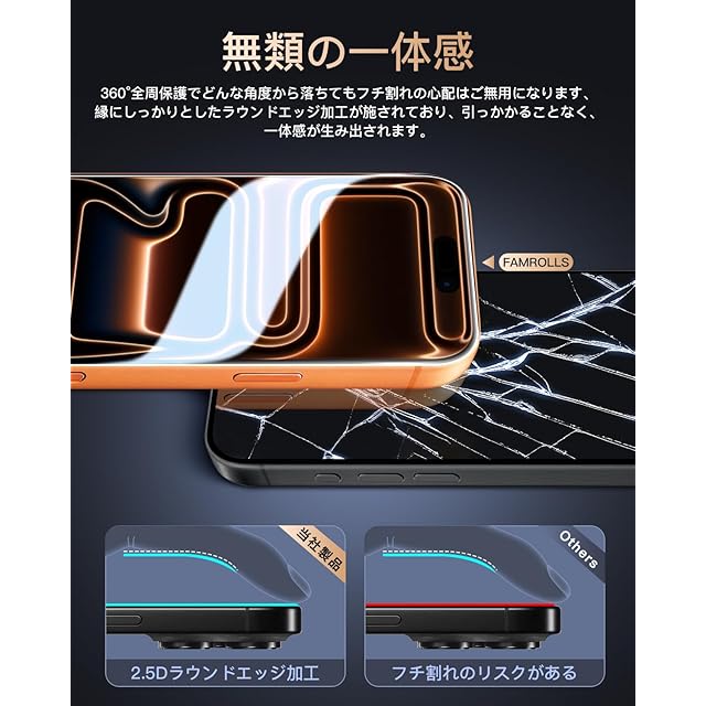【対応機種】 iPhone 17 Pro max 専用に設計されています。素材に日本製の旭硝子を採用。【年間30万販売パフォーマンス】:FAMROLLSの保護フィルムは30万枚の販売パフォーマンスに達成しました。【メーカー正規品】:実店舗を持つFAMROLLSブランドの保護フィルムは市販上の安価品、不良品とは異なり、高価なフィルムと変わらない高品質な保護フィルムを作り出すメーカーです。