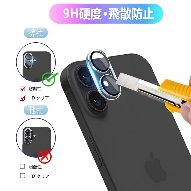 【9H硬度 飛散防止】 対応 いpほね17 カメラフィルム はす旭硝子で作られており、スマホ保護フィルムの中で最高レベルの9H硬度に達しています。手にフィットして持ちやすく滑りにくいので落ちにくいです。万が一落ちてもフィルムが衝撃を吸収してくれるので、レンズの損傷を低限まで抑えられます。また、特殊な飛散防止設計により、ガラスが割れても飛散しないため。