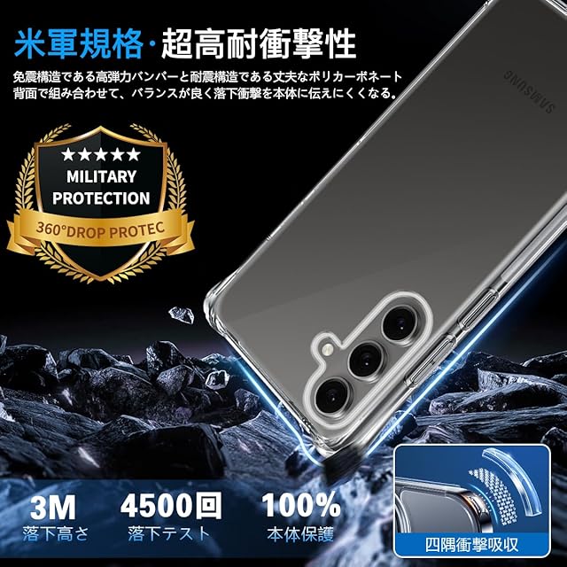 【米軍規格·超高耐衝撃性】 米軍基準のタフさを誇るGalaxy S24 FE ケース。コンクリートの地面に厚さ5mmの合板を敷き、高さ2mから合計26回、違う角度から落下させる実験をしましたが、本体に傷はつきませんでした。また、四隅には高耐震クッションを搭載しており、高い耐衝撃性です。スマホを全方位からしっかりと守ります。