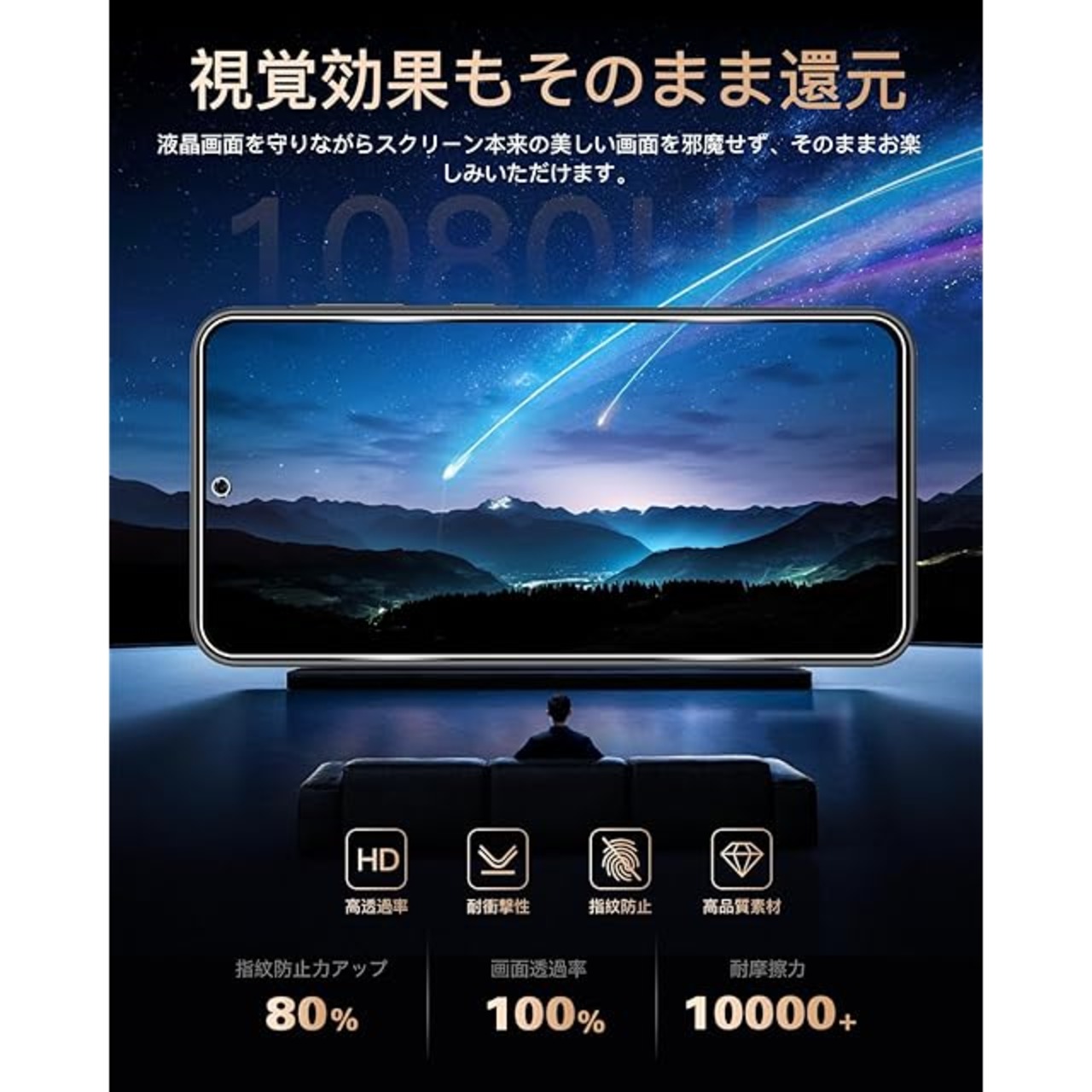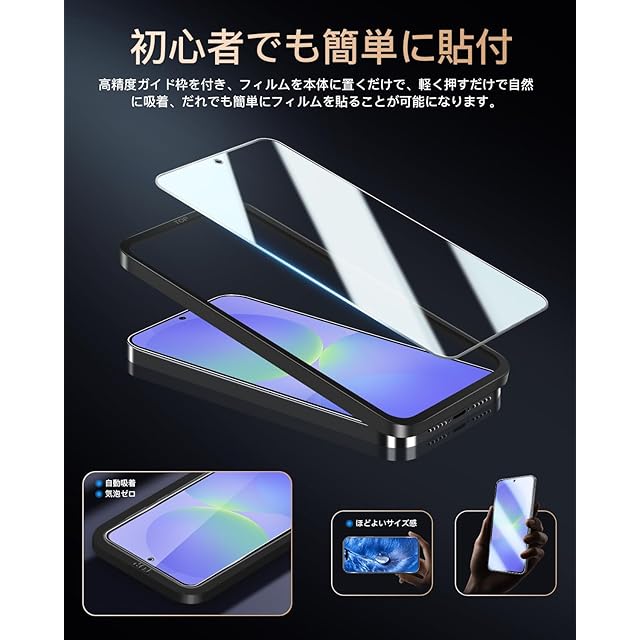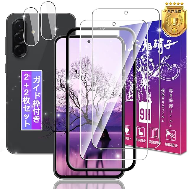 <b>【製品仕様】</b><br><b>対応機種:</b>Galaxy A36 5G<br><b>硬度:</b>9H<br><b>透過率:</b>99%<br><b>厚さ:</b>0.26mm超薄型<br><b>★【強硬度9H 日本旭硝子】</b><br>高品質なの旭硝子製、業界最高レベルの硬度を誇ります。 高温クエンチ処理を経て, このスクリーンプロテクターは、通常のガラスよりも5倍高い125MPaの圧縮強度を有する。<br>万が一破損した際も飛散防止加工によって破片はほとんど飛び散らない安全性の高いガラスになっています。<br><b>★【超高透過率】</b><br>透過率は約99%に達し、 画質も損なわないです。見た目・触り心地ともに何も付けてない状態と殆ど変わりません。<br>厚さ0.26mmの超極薄で,ハイビジョンの美しい画像を再現します。<br><b>★【指紋防止& 撥水撥油】</b><br>ガラスフィルムには撥油コーティングが施されており、指紋や汚れなどに強くなめらかな操作感を実現、<br>付着した汚れなどは簡単に拭きとれます。<br><b>★【スムーズな画面操作】</b><br>タッチパネルの感度が良くて、長時間ゲームをしても快適な操作可能です。<br><b>【パッケージ内容】</b><br>2×強化ガラス保護フィルム<br>2xカメラ保護フィルム<br>1 xガイド枠<br>1 x 取扱説明書<br><b>【使い方】</b><br>1.スマホ電源をオフにし、保護フィルムとクリーニングクロスなどを取り出してください。<br>2.液晶画面の汚れを拭き取る。<br>3.ホコリ取りシートを使って、液晶画面に残ったホコリや布繊維を取り除きます。<br>4.ガイド枠を本体位置に合わせて取り付ける。ホコリ取りシールを再度使用し、ホコリを除去する。<br>5.ガラスフィルムを取り出して、白い台紙を後ろから丁寧に剥がしてください。液晶画面に合うよう慎重にガラスフィルムをのせます。<br>6.保護フィルムを置いた後、指でゆっくりと液晶画面の最初から最後までスライドします。保護フィルムは自動的に端に吸着しますので、少々お待ちください。<br>7.残った気泡をクリーニングクロスで、フィルムの外側に向かって指で押し出すようにして取り除きます。<br>8.貼り付けが完了。クリーニングクロスで液晶画面をよく拭いてください。<br><b>【安心】</b><br>こちらのギャラクシー A36 5G 用強化ガラスフィルムには180日間の安心ながあります。<br>お客様にお届け前に検査スタッフが1枚づつ品質チェックしておりますが、ご使用前に万が一、不良品がお手元に届いた場合は返金、交換、返品等の対応を取らせて頂きますので、安心してご注文ください。