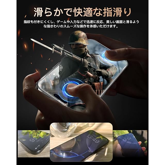 【指紋、油、水防止】ガラスフィルムの表面特殊な疎油処理されているため、画面感度に影響しなくて、簡単にタッチすることができ、指触りが抜群です。指紋や油分·水分の汚れが付きにくい、汗や皮脂、化粧品等が画面についてしまってもさっとひと拭きするだけです。