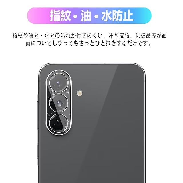 <b>【製品仕様】</b><br><b>対応機種:</b>Galaxy A56 5G <br><b>硬度:</b>9H<br><b>透過率:</b>99%<br><b>厚さ:</b>0.26mm超薄型<br><b>★【強硬度9H 日本旭硝子】</b><br>高品質なの旭硝子製、業界最高レベルの硬度を誇ります。 高温クエンチ処理を経て, このレンズプロテクターは、通常のガラスよりも5倍高い125MPaの圧縮強度を有する。<br>万が一破損した際も飛散防止加工によって破片はほとんど飛び散らない安全性の高いガラスになっています。<br><b>★【超高透過率】</b><br>透過率は約99%に達し、 画質も損なわないです。見た目・触り心地ともに何も付けてない状態と殆ど変わりません。<br>厚さ0.26mmの超極薄で,ハイビジョンの美しい画像を再現します。<br><b>★【指紋防止& 撥水撥油】</b><br>カメラフィルムには撥油コーティングが施されており、指紋や汚れなどに強くなめらかな操作感を実現、<br>付着した汚れなどは簡単に拭きとれます。<br><b>【パッケージ内容】</b><br>2×強化ガラスカメラ保護フィルム<br>1 x 取扱説明書<br><b>【使い方】</b><br>1.スマホ電源をオフにし、カメラ保護フィルムとクリーニングクロスなどを取り出してください。<br>2.レンズの汚れを拭き取る。<br>3.ホコリ取りシートを使って、レンズに残ったホコリや布繊維を取り除きます。<br>4.カメラ保護フィルムの裏面の保護シートを剥がしてください。カメラ保護フィルムをレンズに合わせて軽く置いてください。<br>5.カメラ保護フィルムを置いた後、指でゆっくりとレンズの最初から最後までスライドします。カメラ保護フィルムは自動的に端に吸着しますので、少々お待ちください。<br>6.残った気泡をクリーニングクロスで、フィルムの外側に向かって指で押し出すようにして取り除きます。<br>7.貼り付けが完了。クリーニングクロスでレンズをよく拭いてください。<br><b>【安心】</b><br>こちらの Galaxy A56 用レンズフィルムには180日間の安心ながあります。<br>お客様にお届け前に検査スタッフが1枚づつ品質チェックしておりますが、ご使用前に万が一、不良品がお手元に届いた場合は返金、交換、返品等の対応を取らせて頂きますので、安心してご注文ください。