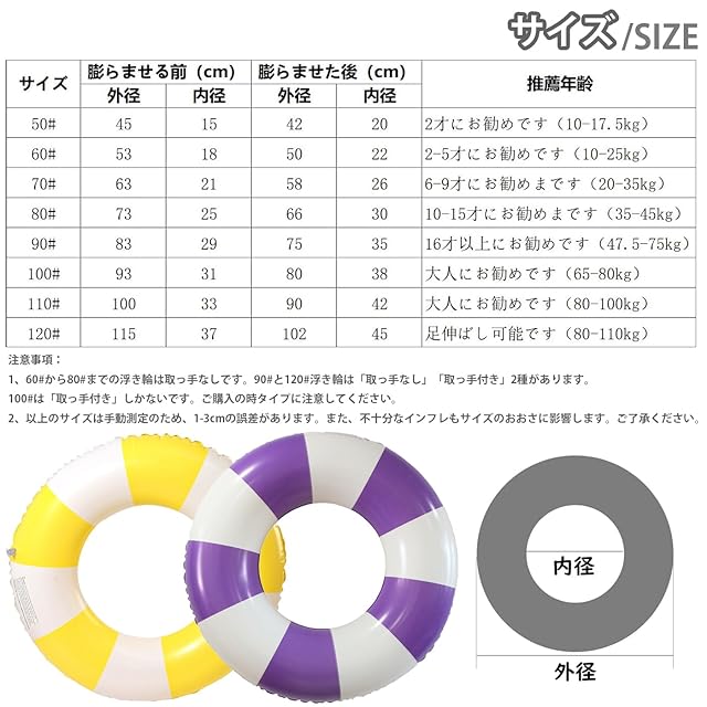 浮き輪 60#取っ手なし/70c#取っ手なし/80#取っ手なし/90#取っ手なし、が選択できます。サイズ: 直径70#:推薦年齢6-9歳 推薦体重:20-35KG、直径80#:推薦年齢10-15歳 推薦体重:35-50KG、直径90#:推薦年齢16歳以上大人 推薦体重47-75KG、直径100#:推薦年齢16歳以上大人 推薦体重65-80KG、直径120#:推薦年齢16歳以上大人 推薦体重80-110KG、ご注意:90#などは直径ではなく、ただのマークです。実際のサイズ説明はは、写真を参照してください。