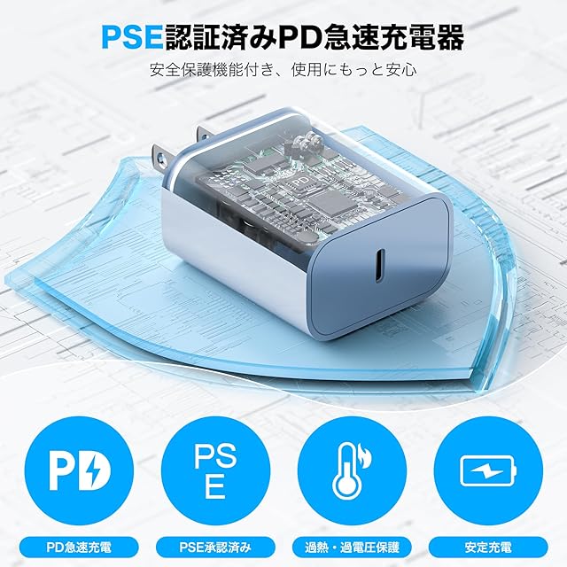 【PSE認証済で・安全】当社のiPhone充電器はPSE認証を取得し、厳格な品質管理を通じて、更に過熱、過充電、過放電および回路ショート防止など給電保護機能搭載しており、iPhone/iPadデバイスに自動的に必要な電流に適合し、迅速かつ安定してデバイスを充電できます。
