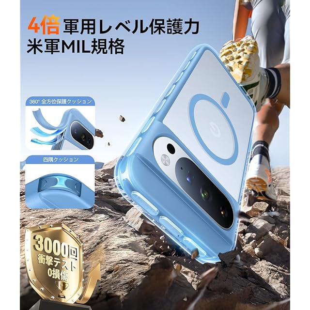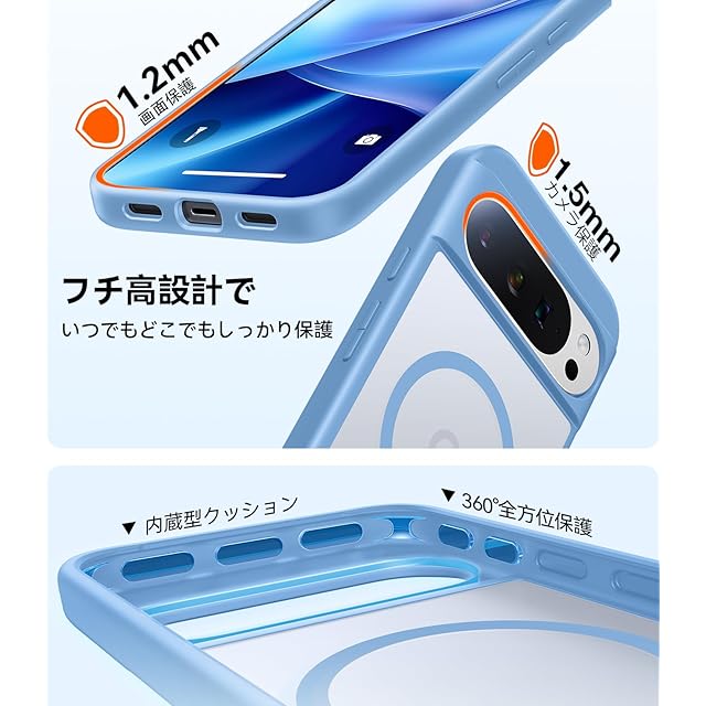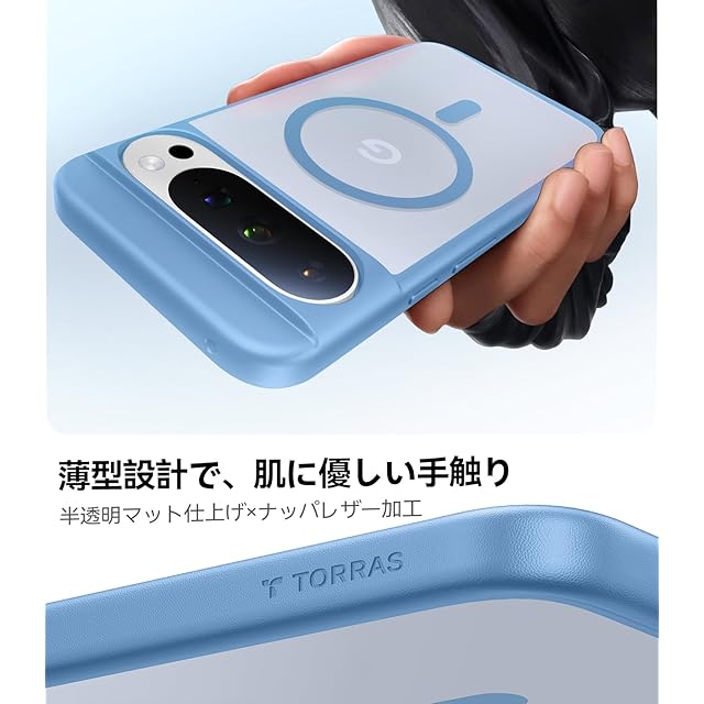 商品名:TORRAS Google Pixel 10 / Pixel 10 Pro 用 ケース【米軍規格・Magsafe 対応】 衝擊吸収 ワイヤレス充電対応 半透明 黄変防止 防指紋 防滑 エアバッグクッション 搭載マグネット カラー交換可能ボタン Guardian-Mag ブルー