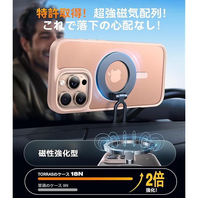 【本当!? 特許取得のマグネット!これが驚異の安定性!】軽く吸着し、瞬時に強力かつ精密にフィットする!TORRAS特許技術に基づく N52 マグネットは最適な配列で設計されており、他のケース磁石と比べて 40%も強い。ワイヤレス充電から車載ホルダーまで、幅広いMagSafe アクセサリーと簡単に互換性がある。どんな揺れにも強く、しっかり固定されるから、簡単には外れない!対応機種:iPhone 16 Pro 用 ケース