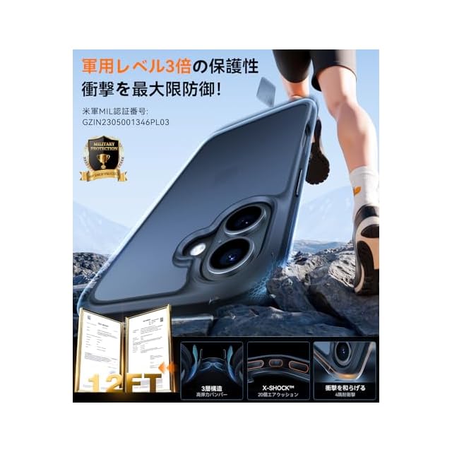 【米軍MIL規格、360°全方位保護】対応機種:iPhone 16 用 ケース (6.1インチ) 3倍米軍MIL規格防護。米軍MIL認証番号:GZIN2305001346PLO3 「Guardian Series」は7年間の進化で、落下防止と保護力にこだわったTORRASの最強保護シリーズである。TORRASラボで3.66mの高さから26方向で4,000回以上の落下テストをクリアし、完全無傷を実現する!ケースの四隅には最新の第五世代のX-SHOCKエアバッグ構造を採用しており、四辺には360°ランニングトラック型のエアクッション構造を設計。全方向・死角なしでスマートフォンを保護できる。