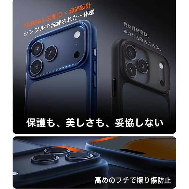【カメラと画面をしっかり保護、放熱も安心】縁高デザインでカメラと画面をしっかりガード。広い開口部でカメラ周辺の放熱を妨げず、スマホ本来の放熱性能を最大限に維持。薄型でワイヤレス充電もスマホをケースに入れたままどうぞ。ビデオ会議、運動やゲーム、撮影を長時間楽しむときも安心。(対応機種:phone17pro ケース)