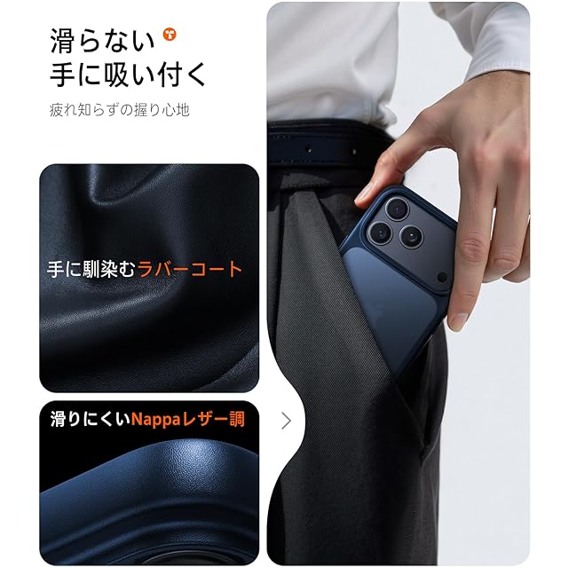 【防滑と快適さの完成形、7年の進化】NaPPaレザー調の微細なテクスチャーとラバー塗装を組み合わせ、手に自然に馴染む防滑性を実現。サラサラで滑らか、高級マウスのような上質な手触り。7年間の改良の末に辿り着いた、滑りにくさと心地よさの究極バランスです。手に握った瞬間から安心感と満足感が広がり、長時間の操作や持ち歩きでも疲れにくく、滑り落ちの不安から解放されます。(対応機種:For iphone17 pro ケース)