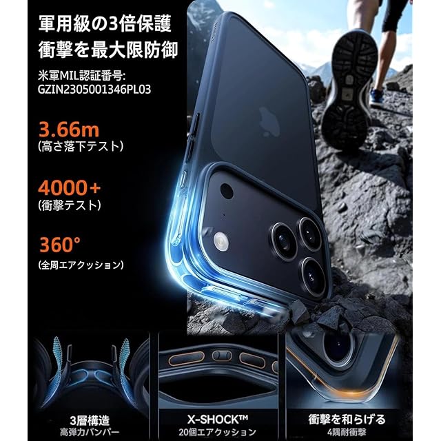 【落下も怖くない!3倍耐衝撃・米軍MIL規格】ランニングもサイクリングも、通勤や仕事中のうっかり落下──どんな瞬間でも、大切なスマホを守り抜く。高耐久複合素材を採用し、ケース全周には複数のエアバッグ、四隅にはX-SHOCK構造を搭載、衝撃を効果的に吸収し、ダメージを30%軽減!米軍MIL規格認証取得(No.GZMR220702237705)。3.66mの高さから26方向・4,000回の落下テストをクリアしたいphone17pro 用 ケース。
