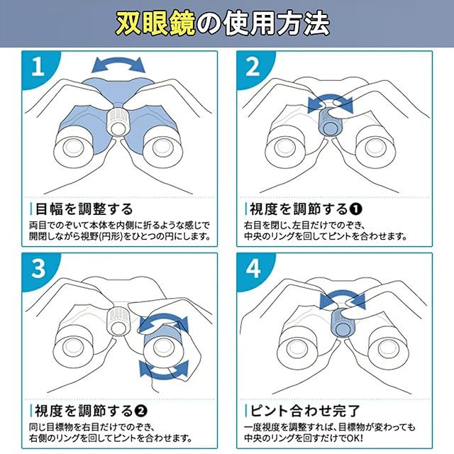 生活防水&使用方法:この製品は生活防水レベルに達することができます。雪や雨が本体に降っても、乾いたきれいなポリエステルまたは両面フランネルで拭き取るだけで、その後の使用に影響しません。32mmから75mmまでの目幅は調整可能で。たった3つのステップで臨場感あふれる画像を楽しめます。①目幅を調整 → ②ピントリングを調整 → ③視度調整リングを回す。自分に合った目幅に調整できます。
