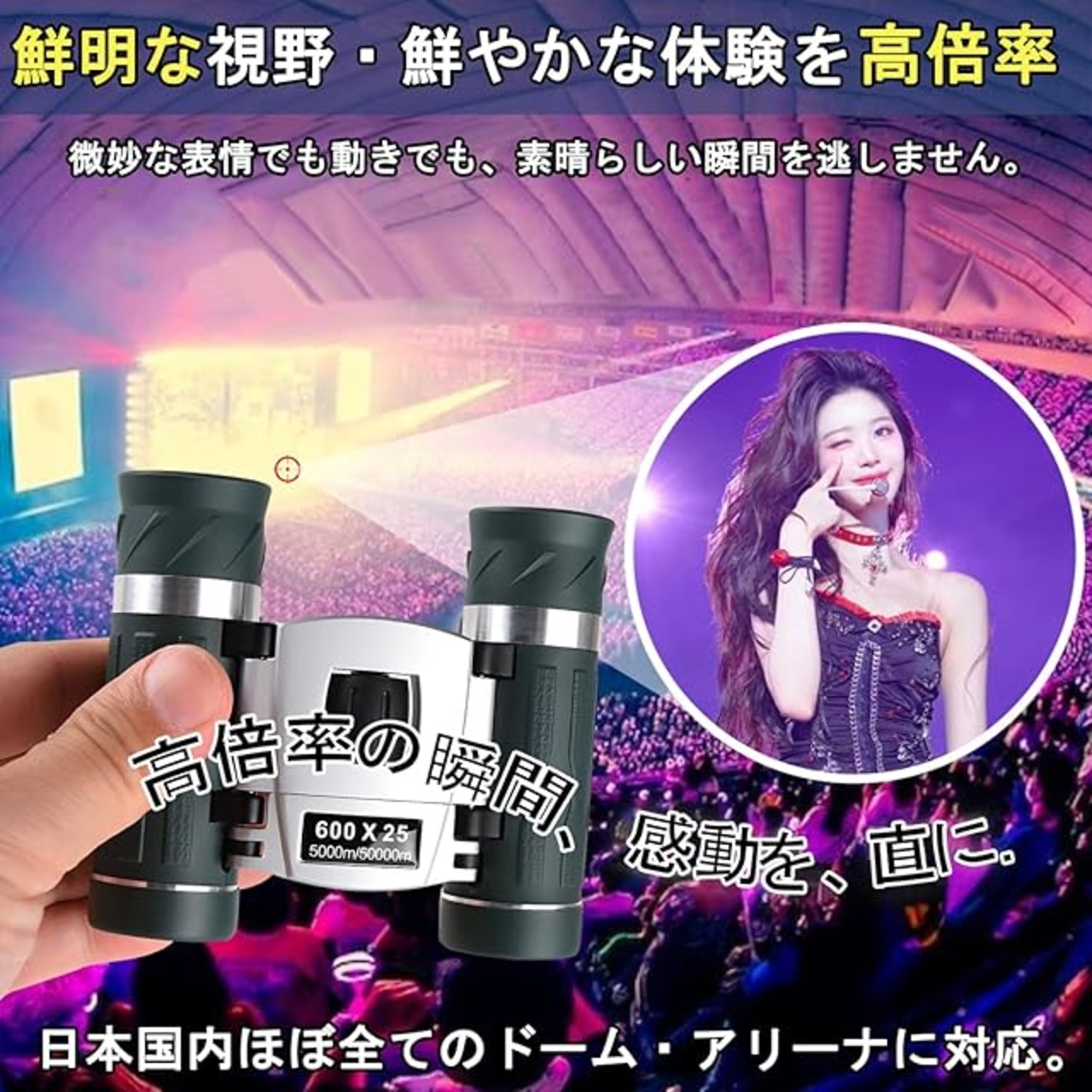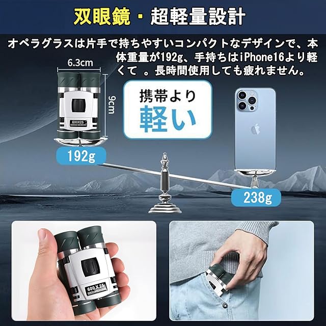双眼鏡 ライブ用 ドーム&超軽量&コンパクト:オペラグラスは片手で持ちやすいコンパクトなデザインで、本体重量が192g、手持ちはiPhone16より軽くて 。長時間使用しても疲れません。コンパクトでカバンや首掛けて持ち歩いても邪魔になりません。折りたたむとさらにコンパクトになり、バッグに楽々収納できます。お子様や女性に最適。コンサートやスポーツ観戦、ライブ、オペラ、観劇、野鳥観察などに最適です。