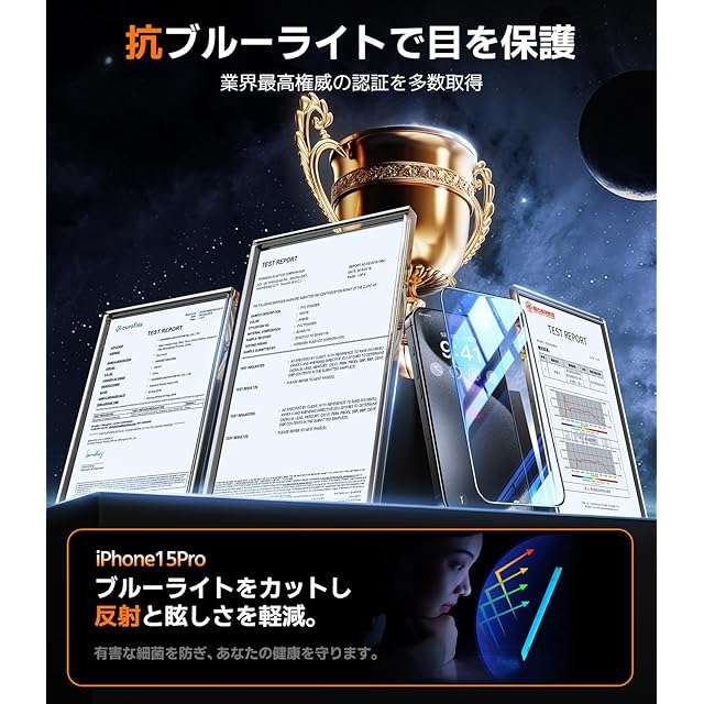 【超クリアなロスレス画質&健康を全面的に守る】このいphone15 pro 保護フィルムは、新しくアップグレードされた高透過率素材を採用し、高透光率、スマホ画面のオリジナルの高精細な画質を再現、超クリアな視覚体験を提供します。また、弊社のいphone15pro フィルムは、国際認証のブルーライト防止テストと抗菌テストをクリアしています。ガラスフィルム表面のAnti-Reflective/Anti-Blue Lightコーティングにより、ブルーライトをカットし、長時間や夜間にスマホを使用する際、ブルーライトが視網膜に与える潜在的なダメージを防ぎます。 目を大切に!さらに、最新のナノ抗菌技術を採用し、表面に付着する99.9%の細菌を強力に抑制します。お子様も安心して触れることができ、あなたとご家族の健康を全面的に守ります!