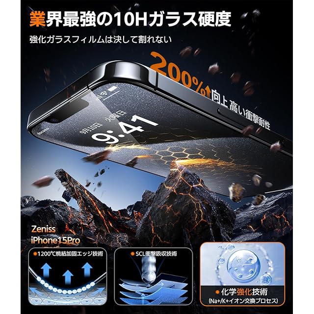 【硬度レベル!10H 強化ガラス フィルムで究極の保護を】弊社のiphone15pro用の フィルムは、米軍規格の航空宇宙グレードの高アルミシリコンガラス素材を使用し、最新のNa+/K+イオン交換技術により、ガラス内部に圧縮緩衝層を形成しています。1200℃で10時間の高温硬化を繰り返し強化、10H硬度レベルを実現。硬度と耐衝撃性が市販の普通製品より20倍も高いです。200%の保護力で衝撃や傷からiPhoneを最大限に守ります。鍵やコインなどの鋭利な物と一緒にバッグに入れても傷がつきません!さらに、ガラスは破片飛散防止加工が施されており、使用者の安全を確保する。 安心してお使いいただけます。絶対的な安心感を与えます!