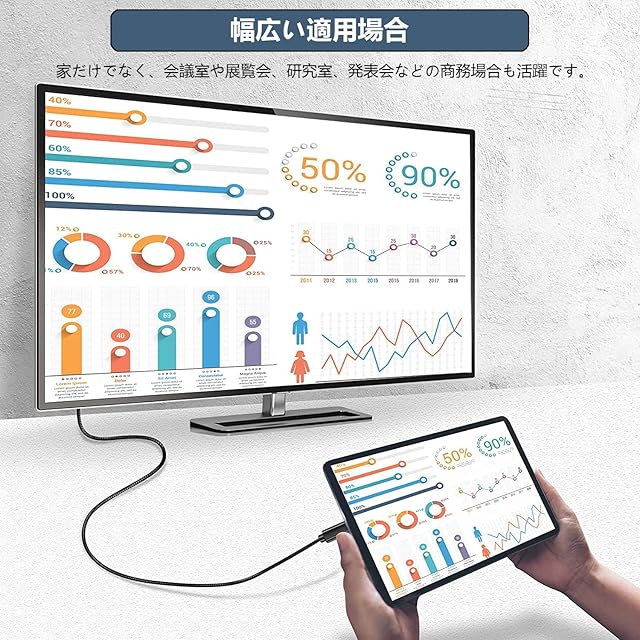 【広範な互換性でマルチデバイス接続】USB C HDMI ケーブルは、Thunderbolt 3/4ポートを搭載したMacBook Pro/Air(M1/M2/M3)、iPad Pro/Air、Surfaceシリーズ、Huawei Matebookなど様々なノートPCに完全対応。さらに、iPhone 15/15 ProシリーズやGalaxy S/Noteシリーズなど、USB3.1 Gen1/Gen2規格に対応したスマートフォンとの接続も可能です(※ご利用端末の端子規格をご確認ください)。