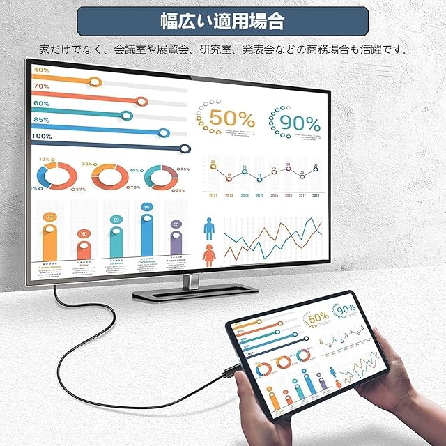【4K高画質映像出力】USB-CからHDMIへの変換ケーブルで、大画面変換。 4K(3840*2160)@60Hz動画配信やデータ転送ができます。 残像感を大幅に削減し鮮明な映像を楽にご視聴いただけます。 下位互換性備え、2K@60Hz、1080p@60Hz、1080I、720p等のHD解像度にも対応しています。