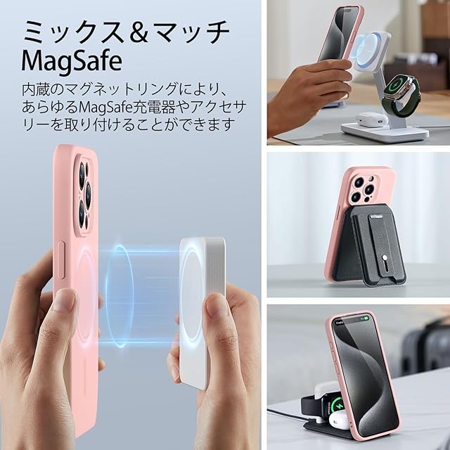 【強力吸着・MagSafe対応】ESR iPhone 15 Pro Max 用 ケースは1,200 gの吸着力を持つ強力な内蔵磁石により、多種なマグネットアクセサリーとの素晴らしい組み合わせを実現でき、ガッチリ吸着する事でスマホケースを装着した15 Pro Maxを急速にワイヤレス充電できます