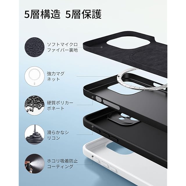 【三層保護】:硬質ポリカーボネート製コアとシリコン製外装が衝撃吸収し、落下や衝撃から保護する一方、ベルベットのように柔らかいマイクロファイバー製裏地が、スマホに傷が付くのを防ぎます