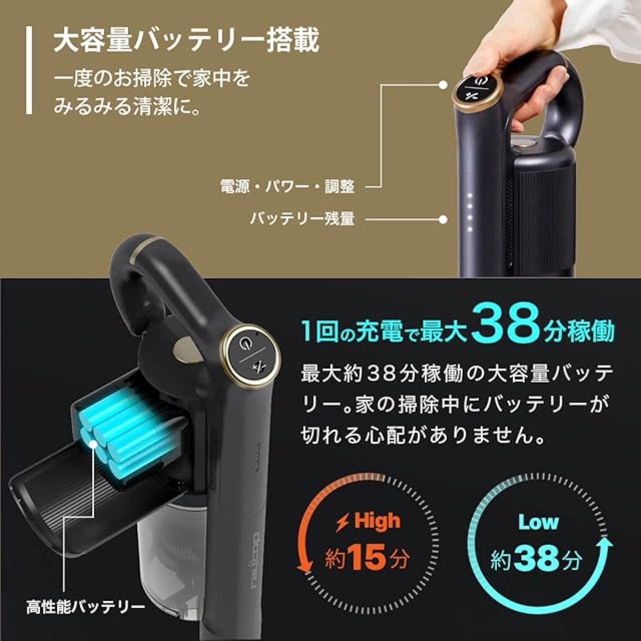大容量バッテリー搭載:最大約38分稼働の大容量バッテリー搭載で掃除中にバッテリーが切れる心配不要。シンプルな操作パネルでバッテリーの残量が一目で分かる。