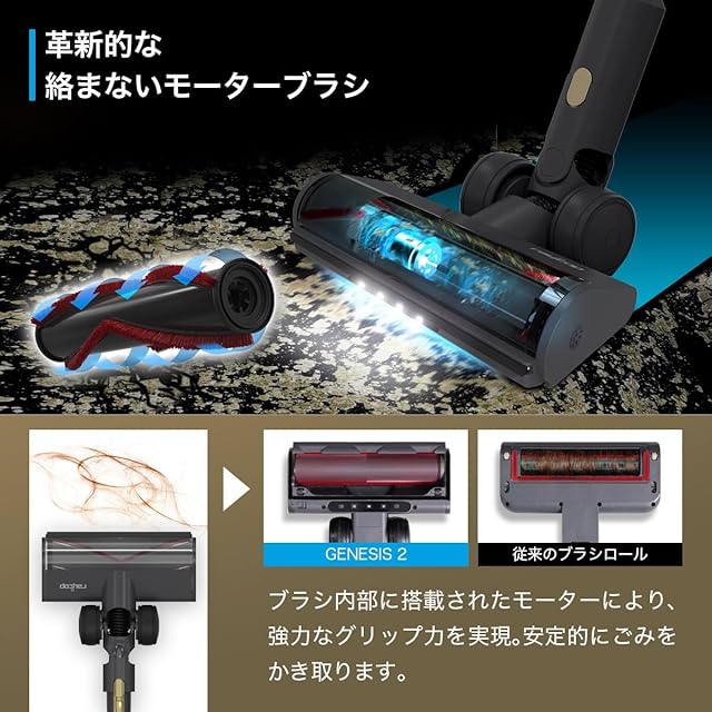 革新的な絡まないモーターブラシ':ブラシ内部に搭載されたモーターにより、強力なグリップ力を実現。強力なグリップ力で細い毛も絡みにくい長い髪の毛やペットの毛がブラシに巻き込まれないので、ブラシの掃除は不要。