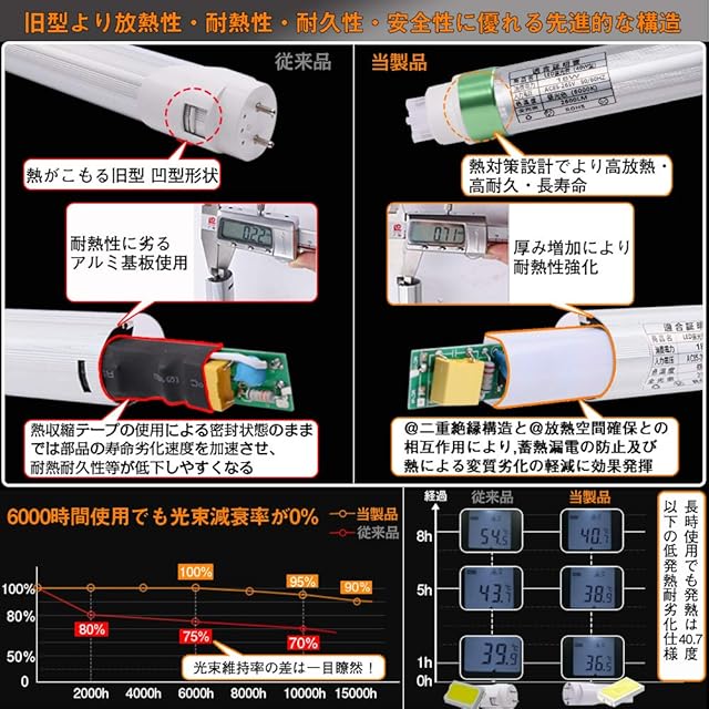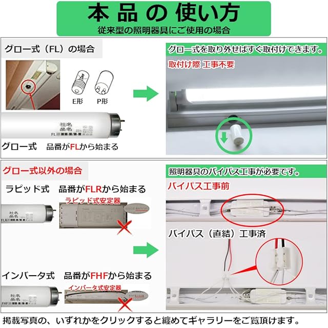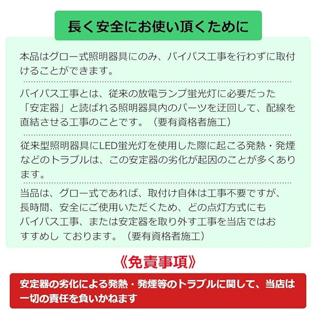 ご注意事項※ 本製品は両側給電仕様の為、片側給電式やラピッドスタート,インバーター式のご利用は危険ですのでお控えください。尚、バイパス工事が必要な場合、電気工事業者にご相談ください。