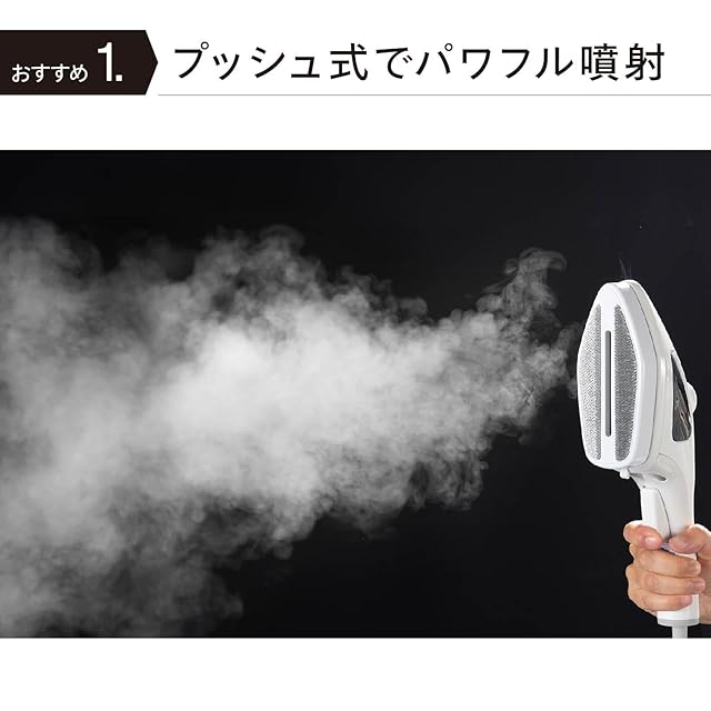 【プッシュ式でパワフル噴射】簡単に操作ができるプッシュ式で12個の穴からスチームが噴射します。 厚手の衣類にも便利な1ショット約0.4g のパワフルスチーム。衣類をハンガーにかけたままシワ伸ばしができるので、アイロンがけの負担を大幅に軽減。