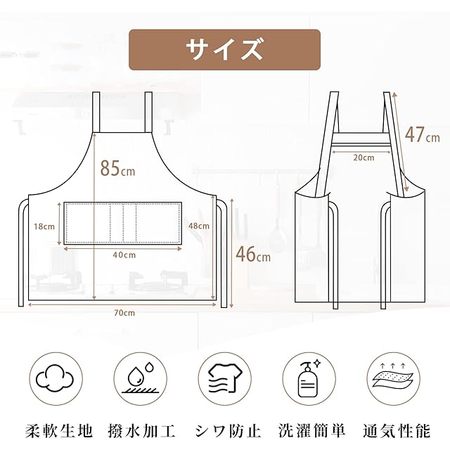 シンプルながら洗練されたデザインのエプロンは、男女問わず幅広い世代に人気のアイテムです。キッチンでの料理はもちろん、ガーデニングやDIY、カフェや雑貨店など、さまざまなシーンで活躍。大容量ポケット付きで実用性も抜群。透けにくく汚れに強い素材を使用し、ノーアイロンでシワもつきにくいため、お手入れも簡単です。見た目の美しさと機能性を兼ね備えた、毎日の作業が楽しくなるエプロンです。