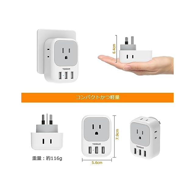 【軽量・便利】変換プラグは小型(本体サイズ:7.9*5.6*6.4cm)で持ち運びが便利です。また100-250Vの入力対応しているので、現地oタイプ コンセントの国への海外旅行、出張、留学に最適です。