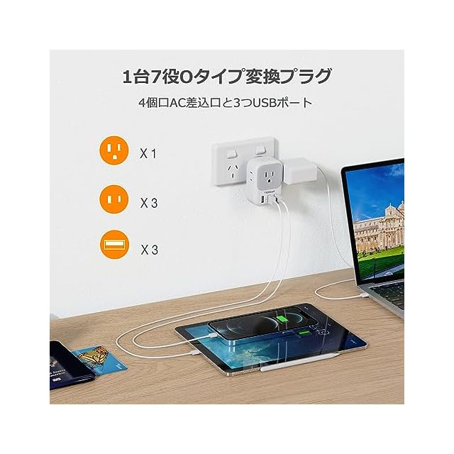 【コンセント不足解消】このOタイプ変換アダプターは、1つの変換プラグを4個口AC差込口と3つUSBポートに変えます。ACコンセントは各方向に分配して、大きなアダプター同士が同時に挿入してもお互いに干渉せずに使用できます。コンセント不足を解消します。