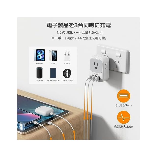 【3つUSB付き 海外プラグ o】3つのUSBポート合計3.0A出力で、単一ポート最大2.4Aで急速充電可能。スマホ、モバイルバッテリー、ノートパソコン、MP3/4/5、カメラ、タブレットなどのUSBデバイスを急速充電できます。海外でも充電も便利です。