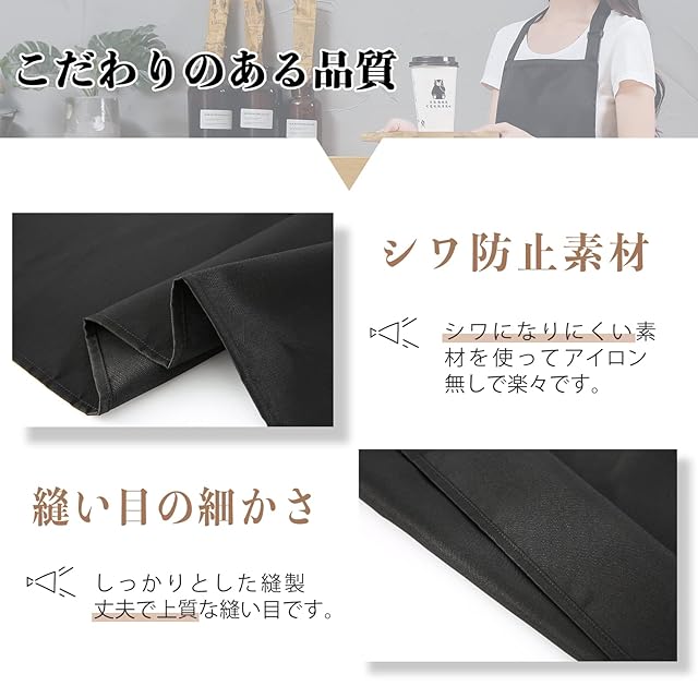 【便利な首掛け型】シンプルな首掛けタイプのエプロンで、身長に合わせて紐の長さを調整可能です。ナイロン製のエプロンに比べて丈夫で、縮みにくく、シワにもなりにくい素材を使用しています。腰紐もしっかりしているため、繰り返しのご使用にも安心してご利用いただけます。
