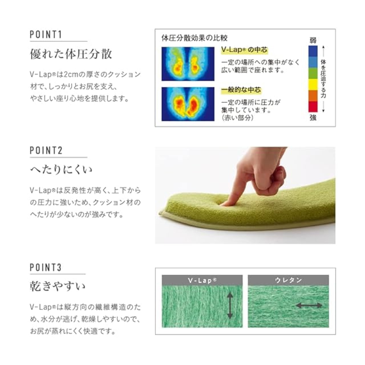 【優れたクッション材】クッション材にはテイジンの特殊クッション材 V-Lapを使用。優れた体圧分散でしっかりお尻を支え、やさしい座り心地。上下の圧力に強いので、へたりにくい。水分が逃げやすく、乾燥しやすい。お尻も蒸れにくく快適。