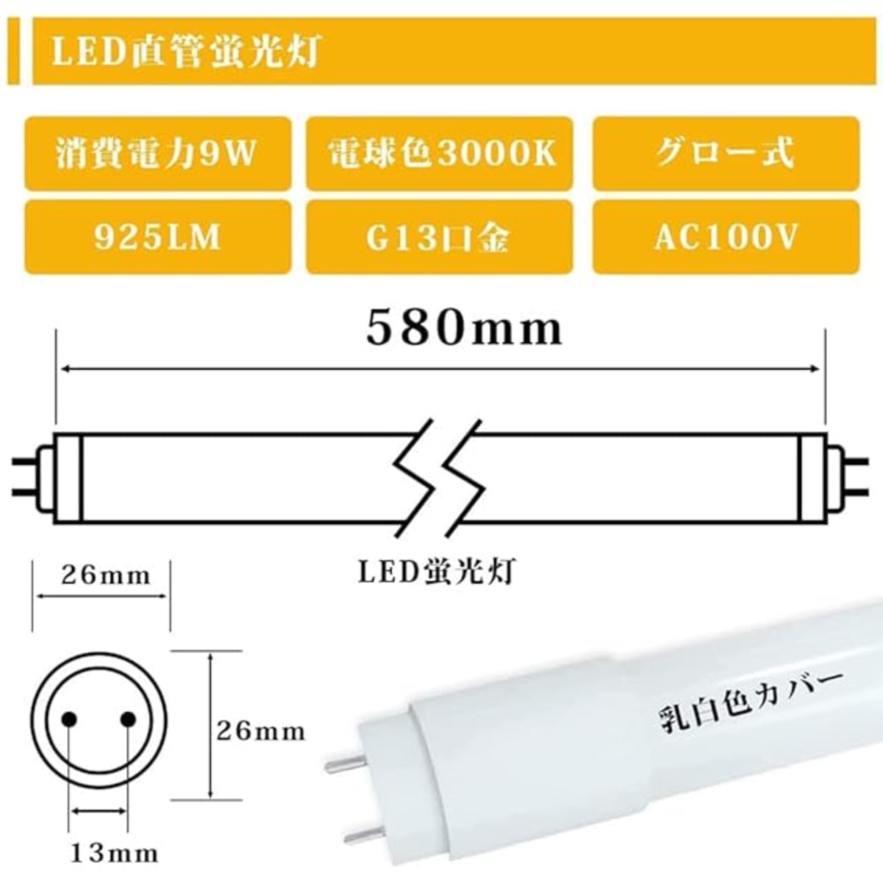 【20w形直管蛍光灯】消費電力:9W 電圧:AC100V 50/60Hz 口金:G13 T8 色温度:電球色 3000K 両側給電タイプLEDランプ 高輝度:925LM ビーム角:270度 寸法:φ 26 × L580mm 全光束。