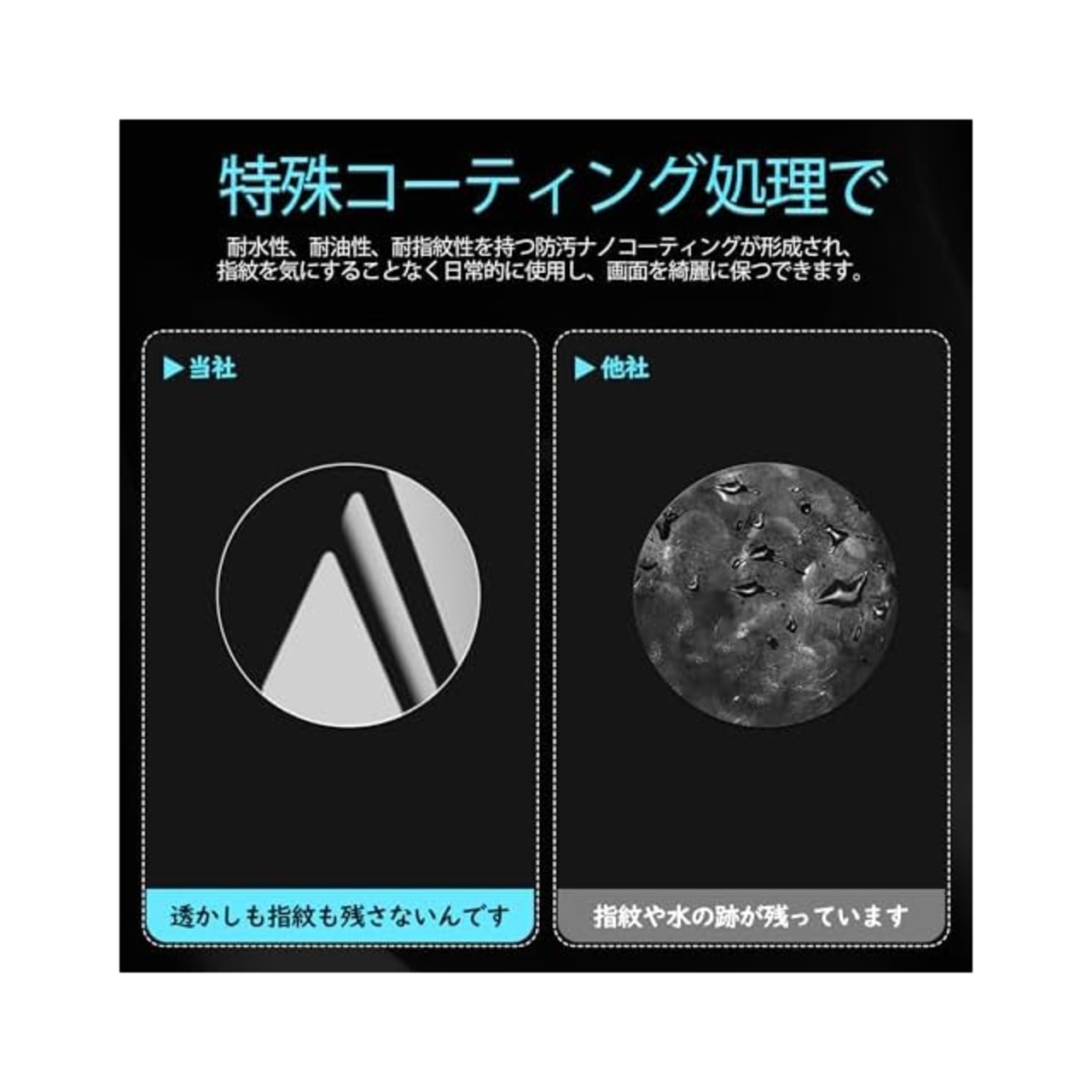 【指紋防止、高感度タッチ】ガラスフィルムには撥油コーティングが施されており、指紋や汚れなどに強くなめらかな操作感を実現、付着した汚れなどは簡単に拭きとれます。こちらは高耐久撥油コーティングが施され、つるつるな滑り感を実現!ゲームしても渋くなし!